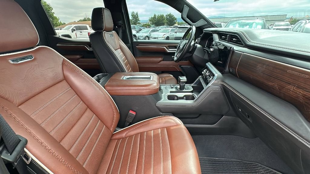 Titanium Rush Metallic 2022 GMC Sierra 1500 Denali Ultimate 10-Speed Automatic 3.0L I6 4WD 10-Speed Automatic, 4WD, Alpine Umber Leather, 120-Volt Bed Mounted Power Outlet, 120-Volt Instrument Panel Power Outlet, 2 Charge/Data USB Ports Inside Center Console, 2 Type-C Charge-Only Rear USB Ports, 2 USB Ports, Auto-Locking Rear Differential, Bed View Camera, Bose Premium Series w/12-Speaker System, Carbon Fiber Composite Bed, Chrome Recovery Hooks, Color-Keyed Carpeting Floor Covering, Compass, Deep-Tinted Glass, Electric Rear-Window Defogger, Electrical Steering Column Lock, Floor-Mounted Center Console, Front Rainsensing Wipers, GMC Connected Access Capable, HD Surround Vision, Heated 2nd Row Outboard Seats, Heated Driver & Front Outboard Passenger Seating, Heavy-Duty Air Filter, Hill Descent Control, Hitch Guidance, Hitch Guidance w/Hitch View, In-Vehicle Trailering App, Integrated Trailer Brake Controller, Keyless Open & Start, LED Cargo Area Lighting, Multicolor 15 Diagonal Head-Up Display, MultiPro Audio System by Kicker (LPO), Navigation System, OnStar & GMC Connected Services Capable, Perimeter Lighting, Power Door Locks, Power Front Passenger Windows w/Express Up/Down, Power Front Windows w/Driver Express Up/Down, Power Rake & Telescoping Steering Column, Power Rear Windows w/Express Down, Power Sliding Rear Window w/Rear Defogger, Power Sunroof, Preferred Equipment Group 5SB, Push Button Start, Rear Cross Traffic Braking, Rear Pedestrian Detection, Remote Vehicle Starter System, SiriusXM w/360L, Steering Wheel Audio Controls, Theft Deterrent System (Unauthorized Entry), Trailer Camera Provisions, Trailer Side Blind Zone Alert, Trailer Tire Pressure Monitor System, Trailering Package, Ultrasonic Front & Rear Park Assist, Universal Home Remote, Vader Chrome Header w/Signature Denali Grille, Ventilated Driver & Front Passenger Seats, Wi-Fi Hotspot Capable, Wireless Charging, Wireless Phone Projection.