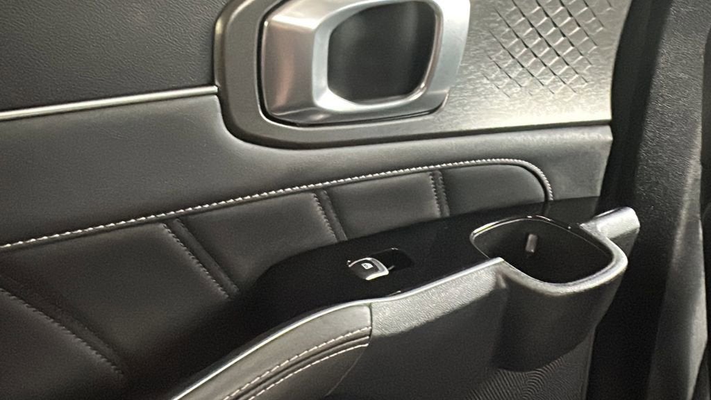 This 2023 Kia Sorento is equipped with AWD, Navigation System, 3.316 Axle Ratio, 3rd row seats: split-bench, 4-Wheel Disc Brakes, 6 Speakers, ABS brakes, Air Conditioning, Alloy wheels, AM/FM radio: SiriusXM, Apple CarPlay & Android Auto, Auto High-beam Headlights, Auto-dimming Rear-View mirror, Automatic temperature control, Brake assist, Bumpers: body-color, Carpet Floor Mats, Delay-off headlights, Driver door bin, Driver vanity mirror, Dual front impact airbags, Dual front side impact airbags, Electronic Stability Control, Emergency communication system, Exterior Parking Camera Rear, Four wheel independent suspension, Front anti-roll bar, Front Bucket Seats, Front Center Armrest, Front dual zone A/C, Front fog lights, Front reading lights, Fully automatic headlights, Heated door mirrors, Heated Front Bucket Seats, Heated front seats, Illuminated entry, Knee airbag, Leather steering wheel, Low tire pressure warning, Occupant sensing airbag, Outside temperature display, Overhead airbag, Overhead console, Panic alarm, Passenger door bin, Passenger vanity mirror, Power door mirrors, Power driver seat, Power Liftgate, Power moonroof, Power passenger seat, Power steering, Power windows, Radio data system, Radio: AM/FM Audio System, Rain sensing wipers, Rear air conditioning, Rear anti-roll bar, Rear reading lights, Rear window defroster, Rear window wiper, Remote keyless entry, Roof rack: rails only, Security system, Smart Key w/ Push Button and Remote Start, Speed control, Speed-sensing steering, Split folding rear seat, Spoiler, Steering wheel mounted audio controls, SynTex Artificial Leather Seat Trim, Tachometer, Telescoping steering wheel, Tilt steering wheel, Traction control, Trip computer, Turn signal indicator mirrors, Variably intermittent wipers, and Wheels: 8.5J x 20 Gloss Black Alloy.